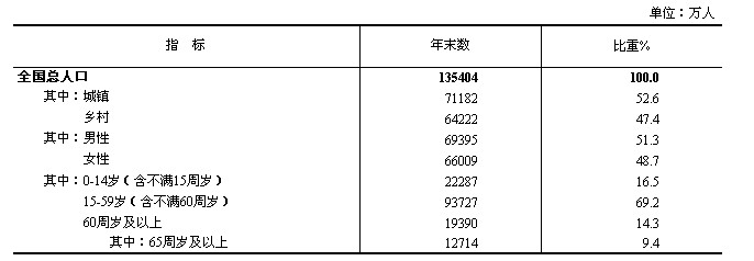 年末全國大陸總人口為135404萬人,比上年末增加669萬人,其中城鎮(zhèn)人口為71182萬人,占總人口比重為52.6%,比上年末提高1.3個百分點。全年出生人口1635萬人,出生率為12.10‰;死亡人口966萬人,死亡率為7.15‰;自然增長率為4.95‰。出生人口性別比為117.70。0-14歲(含不滿15周歲)人口22287萬人,占總人口的16.5%,比上年末提高0.01個百分點;15-59歲(含不滿60周歲)勞動年齡人口93727萬人,比上年末減少345萬人,占總人口的69.2%,比上年末下降0.60個百分點;60周歲及以上人口19390萬人,占總人口的14.3%,比上年末提高0.59個百分點。全國人戶分離的人口[25]為2.79億人,其中流動人口[26]為2.36億人。