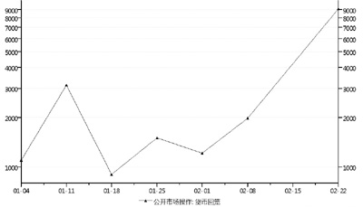 春節(jié)后的一周,央行出手大規(guī);鼗\貨幣達(dá)9100億元人民幣,此舉被市場理解為監(jiān)管層對國內(nèi)資金面開始進(jìn)行微調(diào),銀行系統(tǒng)和銀行間貨幣市場流動性出現(xiàn)拐點(diǎn)!巴鈪R占款較高是央行實(shí)行大規(guī)模回籠資金的主要考慮因素。”光大銀行首席宏觀分析師盛宏清預(yù)計,1月新增外匯占款可能達(dá)到6000億元,2月新增外匯占款則在4000億元附近,因此,央行通過重啟正回購防止流動性過度寬松,使M2增速持續(xù)高于目標(biāo)值。