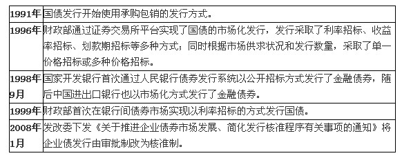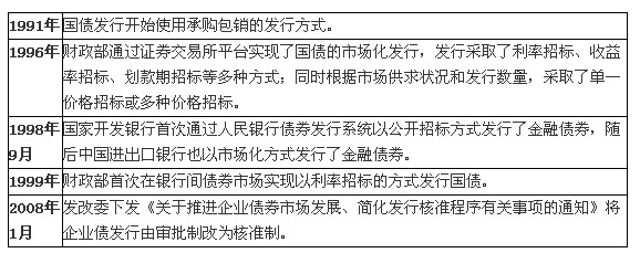 我國(guó)自1991年進(jìn)行國(guó)債發(fā)行方式的市場(chǎng)化改革,1997年銀行間債券市場(chǎng)成立之后,政策性金融債券和國(guó)債陸續(xù)開(kāi)始通過(guò)公開(kāi)招標(biāo)的方式發(fā)行,實(shí)現(xiàn)市場(chǎng)化定價(jià)。在2004年開(kāi)始的新一輪債券市場(chǎng)創(chuàng)新中,面向金融機(jī)構(gòu)推出了一般性金融債、次級(jí)債、混合資本債、資產(chǎn)支持證券,面向非金融企業(yè)推出了短期融資券、中期票據(jù)、超短期融資券和集合票據(jù)等,均實(shí)行市場(chǎng)化方式定價(jià)。企業(yè)債早期由國(guó)家發(fā)展改革委審批,利率水平征求人民銀行意見(jiàn),后來(lái)發(fā)改委簡(jiǎn)化企業(yè)債核準(zhǔn)程序,并逐步實(shí)現(xiàn)債券價(jià)格市場(chǎng)化。目前企業(yè)債發(fā)行利率仍然受到不得高于同期限銀行定期存款利率的40%的限制,短融和中票發(fā)行利率受到銀行間市場(chǎng)交易商協(xié)會(huì)公布的指導(dǎo)下限的約束,但總體上債券市場(chǎng)基本實(shí)現(xiàn)了市場(chǎng)化的定價(jià)方式。