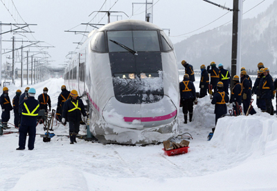 3月3日,在日本秋田縣大山,調(diào)查人員和鐵路工作人員在脫軌列車旁查看。此前一天(3月2日),運載著約130名乘客的日本“小町”號新干線列車在大雪中脫軌。