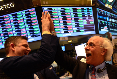 3月5日,在美國紐約證券交易所,兩名交易員在當(dāng)天交易結(jié)束后擊掌相慶。 紐約股市道瓊斯工業(yè)平均指數(shù)當(dāng)日創(chuàng)出歷史新高。開盤后幾分鐘道指便突破歷史最高收盤價(jià)和盤中價(jià)。截至收盤,道指首次站上14200點(diǎn)大關(guān),收于14253.77點(diǎn),漲幅為0.89%。與金融危機(jī)期間的2009年3月的低點(diǎn)相比,目前道指已經(jīng)反彈了一倍以上。