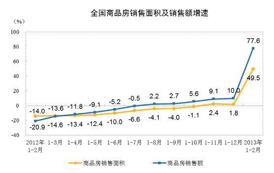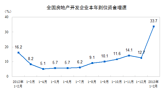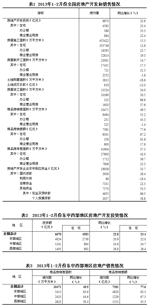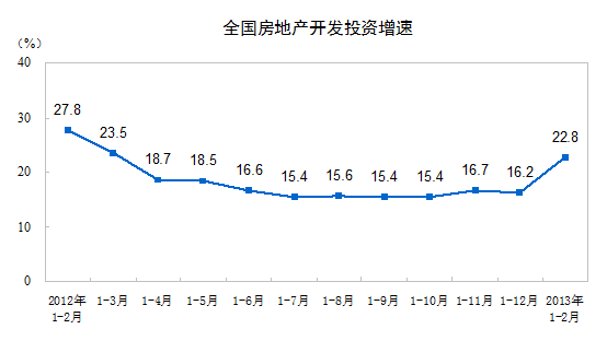 2013年1-2月份,全國房地產(chǎn)開發(fā)投資6670億元,同比名義增長22.8%,增速比去年全年提高6.6個(gè)百分點(diǎn)。其中,住宅投資4583億元,增長23.4%,增速提高12個(gè)百分點(diǎn),占房地產(chǎn)開發(fā)投資的比重為68.7%。