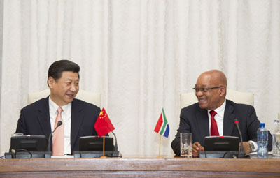 國(guó)家主席習(xí)近平26日在比勒陀利亞同南非總統(tǒng)祖馬舉行會(huì)談。習(xí)近平指出,中國(guó)支持南非辦好金磚國(guó)家領(lǐng)導(dǎo)人第五次會(huì)晤以及金磚國(guó)家同非洲國(guó)家領(lǐng)導(dǎo)人對(duì)話(huà)會(huì),愿同南方一道,加強(qiáng)金磚國(guó)家合作,推動(dòng)金磚國(guó)家加強(qiáng)對(duì)非合作。