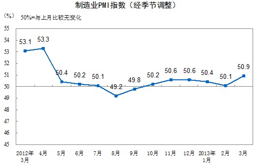2013年3月,中國(guó)制造業(yè)采購(gòu)經(jīng)理指數(shù)(PMI)為50.9%,比上月上升0.8個(gè)百分點(diǎn),連續(xù)6個(gè)月位于臨界點(diǎn)以上。