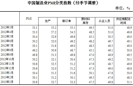 2013年3月,構(gòu)成制造業(yè)PMI的5個(gè)分類指數(shù)4升1降。