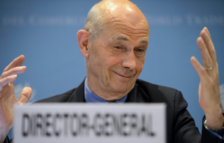4月10日,世界貿(mào)易組織總干事拉米在位于瑞士日內(nèi)瓦的總部出席新聞發(fā)布會。 世界貿(mào)易組織當日宣布,由于受歐洲經(jīng)濟持續(xù)低迷等因素影響,對2013年全球貿(mào)易額增長率的預期由4.5%降至3.3%。這是世貿(mào)組織第二次降低2013年全球貿(mào)易增長預期。