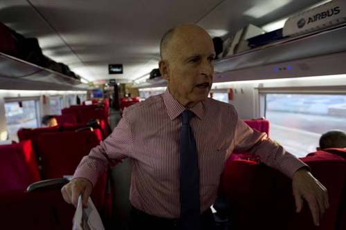 杰瑞-布朗率領的代表團上周四晚間還乘坐了北京南站開往上海的高鐵,5個小時的旅程給代表們留下了深刻印象。北京到上海的高鐵全長750英里大約相當于從圣迭哥到俄勒岡的距離。杰瑞-布朗在高鐵動車上發(fā)表了即興講話,并與同車的中國旅客握手交談。