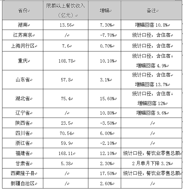 除了湖北和西藏隆子縣的限額以上餐飲收入增幅超過15%,大部分省市1-2月限額以上餐飲收入增幅都在10%以下,新疆和甘肅這樣的西部經(jīng)濟落后地區(qū)限額以上的餐飲收入增幅已經(jīng)跌入3%以下,特別是江蘇南京、陜西、浙江1-2月的限額以上餐飲收入直接進入負增長。而且與去年同期相比餐飲收入增幅回落明顯,湖南、湖北、山東的增幅回落水平都超過了10個百分點。