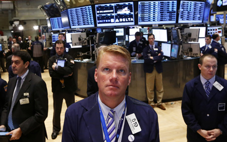 受國際黃金反彈及美國經(jīng)濟數(shù)據(jù)利好推動,紐約股市從前一交易日的暴跌中反彈,三大股指16日上漲報收。 圖為4月16日,在美國紐約證券交易所,交易員在開盤前為美國波士頓馬拉松爆炸案死難者默哀。