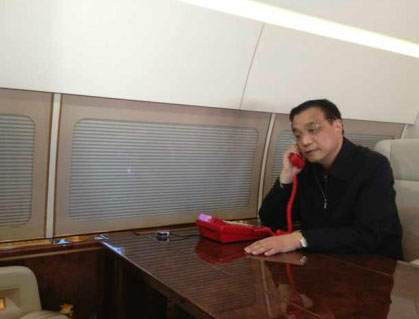 4月20日,在飛往四川途中,李克強總理召開緊急會議,部署抗震救災工作。到達機場后,李克強總理一行分乘四架直升飛機,飛往震中。圖為李克強與四川省委書記王東明通電話。(圖片來源:新華視點微博)