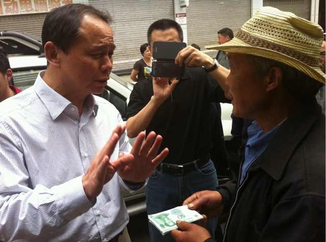 | 人保集團董事長吳焰親手將第一筆5000元賠款送到了客戶駱瑞森手中。劉周維/攝 |