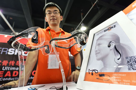 第七屆中國杭州電子信息博覽會近日在杭州和平國際會展中心舉行。圖為工作人員在展示兩款不傷聽力的“雙耳開放骨傳導(dǎo)式耳機(jī)”。