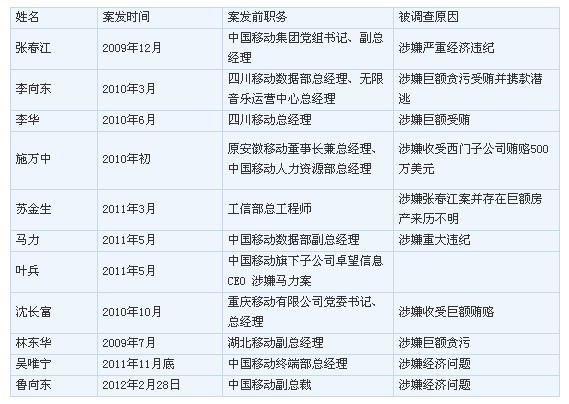 自從2009年12月中國(guó)移動(dòng)原黨組書記張春江涉及第一次腐敗案開始,到如今上述天津移動(dòng)高層涉案,中國(guó)移動(dòng)“落馬”的管理層已經(jīng)多達(dá)12人。與數(shù)據(jù)業(yè)務(wù)相關(guān)的有四川移動(dòng)數(shù)據(jù)部原總經(jīng)理李向東、集團(tuán)原副總經(jīng)理馬力以及數(shù)據(jù)部原部長(zhǎng)、卓望控股CEO葉兵。