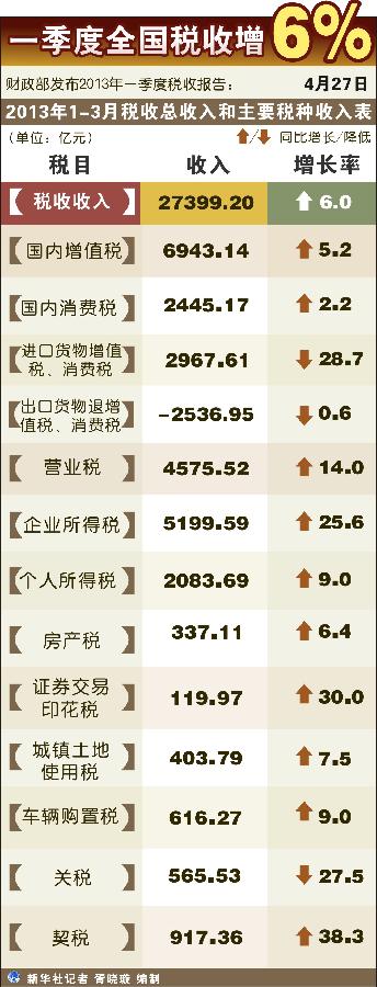 財政部27日發(fā)布2013年一季度稅收報告顯示,今年前三個月全國稅收總收入完成27399.20億元,比去年同期增長6%,增速回落了4.3個百分點,其中部分主體稅種出現(xiàn)負增長,而房地產相關稅收收入則出現(xiàn)反彈。