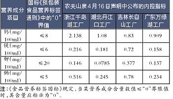 農(nóng)夫山泉內(nèi)控指標(biāo)與《食品營養(yǎng)標(biāo)簽國標(biāo)》中“0”界值的對比