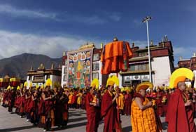 屆時,巨型強巴佛唐卡將在壇城大殿前徐徐展開,接受虔誠的信眾拋獻哈達。當法號齊鳴、法鑼合奏,上千名身著嶄新僧袍的僧人列隊走出措欽大殿,徑直走向寺廟中央的空地,集體誦經祈福。