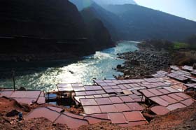 如今,鹽井的鹽業(yè)生產仍保持著原始人工生產方式,鹽民在江兩岸層層疊疊建起幾千塊鹽田,每塊鹽田面積大約有六至八平方米,每次灌滿鹵水,每塊鹽田三兩天就可收獲二十多斤鹽結晶。