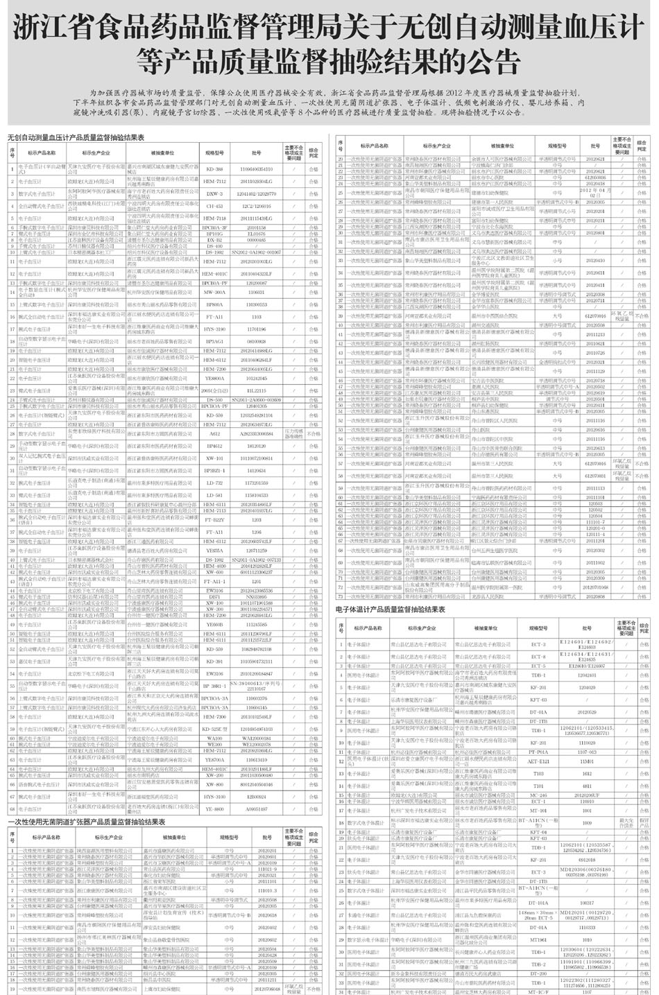 浙江省食品藥品監(jiān)督管理局關(guān)于無(wú)創(chuàng)自動(dòng)測(cè)量血壓計(jì)等產(chǎn)品質(zhì)量監(jiān)督抽驗(yàn)結(jié)果的公告