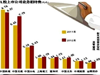 日前,證券財經(jīng)網(wǎng)站全景網(wǎng)的統(tǒng)計顯示,據(jù)2012年年報數(shù)據(jù),去年共有9家公司的業(yè)務(wù)招待費超過1億元,前十名合計達(dá)到29億元。其中絕大多數(shù)為央企,中國鐵建以8.37億元居于首位。另有241家上市公司的業(yè)務(wù)招待費超過1000萬元。