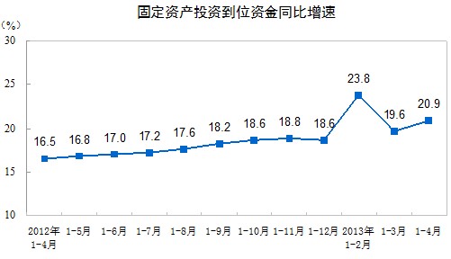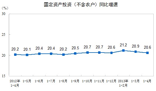 2013年1-4月份,全國固定資產(chǎn)投資(不含農(nóng)戶)91319億元,同比名義增長20.6%,增速比1-3月份回落0.3個百分點。從環(huán)比看,4月份固定資產(chǎn)投資(不含農(nóng)戶)增長1.63%。