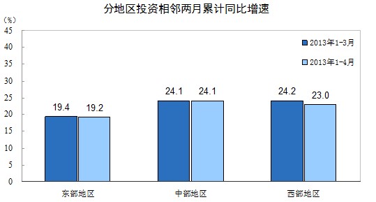 分地區(qū)看,1-4月份,東部地區(qū)投資46113億元,同比增長19.2%,增速比1-3月份回落0.2個百分點;中部地區(qū)投資23537億元,增長24.1%,增速與上月持平;西部地區(qū)投資21046億元,增長23%,增速回落1.2個百分點。