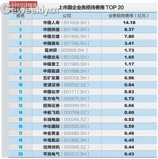 據(jù)港澳資訊統(tǒng)計的數(shù)據(jù)顯示,252家?guī)А皣小北尘暗纳鲜衅髽I(yè),2012年年報中公開披露的業(yè)務招待費一項,總計65.25億元。業(yè)務招待費前20位的上市國企為:中國人壽、中國鐵建、中國交建、中國南車、葛洲壩、中國北車、中國重工、中煤能源、五礦發(fā)展、宏源證券、中國化學、東方電氣、招商證券、中航飛機、長城電腦、中化國際、中金黃金、中海集運、經緯紡機、平高電氣。中國人壽業(yè)務招待費最多,達14.18億元。