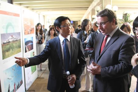 昆侖山公司負責人在活動圖片展中,向參觀展覽的聯(lián)合國副秘書長、聯(lián)合國環(huán)境規(guī)劃署執(zhí)行主任阿希姆·施泰納詳細介紹企業(yè)水資源保護措施。 |