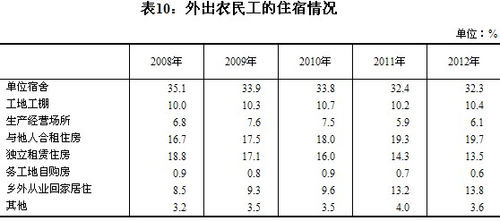 以受雇形式從業(yè)的農(nóng)民工,在單位宿舍中居住的占32.3%,在工地或工棚居住的占10.4%,在生產(chǎn)經(jīng)營場所居住的占6.1%,與他人合租住房的占19.7%,獨立租賃住房的占13.5%,有13.8%的外出農(nóng)民工在鄉(xiāng)鎮(zhèn)以外從業(yè)但每天回家居住,僅有0.6%的外出農(nóng)民工在務(wù)工地自購房。從近幾年外出農(nóng)民工居住情況的變化看,呈現(xiàn)出與他人合租住房比重上升、獨立租賃住房比重下降的趨勢,另一明顯變化態(tài)勢是務(wù)工地自購房比重下降、鄉(xiāng)外從業(yè)回家居住比重上升。