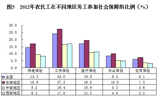 從輸入地看,不同地區(qū)農(nóng)民工社會保障狀況仍存在一定的差距,中西部地區(qū)的農(nóng)民工參保比例比較接近,落后于在東部地區(qū)務(wù)工的農(nóng)民工,2012年中部地區(qū)各項保險參保率的提高幅度略高于東部和西部地區(qū)。