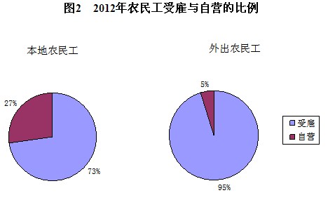 在外出農(nóng)民工中,受雇人員占95.3%,自營人員占4.7%;在本地農(nóng)民工中,受雇人員占72.8%,自營人員占27.2%。自營人員主要從事批發(fā)零售業(yè),占38.9%;其次是從事交通運(yùn)輸業(yè)倉儲和郵政業(yè)占19.3%,從事制造業(yè)占11.9%,從事服務(wù)業(yè)占11.2%。外出農(nóng)民工和本地農(nóng)民工中自營人員所占比重繼續(xù)呈下降趨勢,本地自營和外出自營分別比上年低0.9和0.5個百分點。