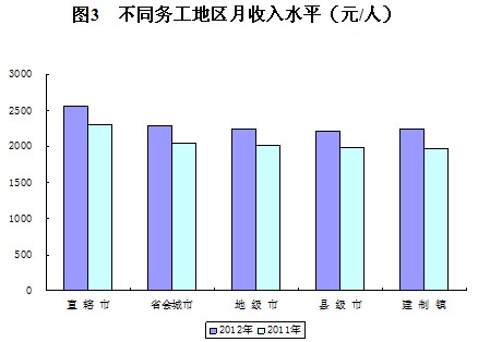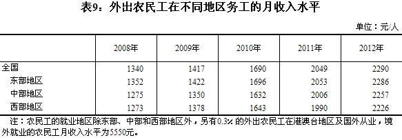 2012年末,外出農(nóng)民工人均月收入水平為2290元,比上年提高241元,增長11.8%,但增加額比上年同期減少118元,增幅回落9.4個百分點。分地區(qū)看,在東部地區(qū)務(wù)工的農(nóng)民工月收入水平為2286元,比上年增加233元,增長11.4%;在中部地區(qū)務(wù)工的農(nóng)民工月收入水平為2257元,比上年增加251元,增長12.5%;在西部地區(qū)務(wù)工的農(nóng)民工月收入水平為2226元,比上年增加236元,增長11.8%。另外,在境外就業(yè)的農(nóng)民工月收入水平為5550元。