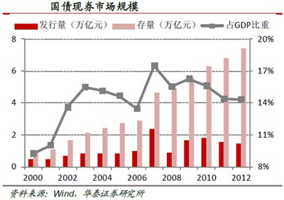 另一方面,我國(guó)自2001年起開始采用貼現(xiàn)方式發(fā)行1年期以下的短期國(guó)債品種,同時(shí)開始發(fā)行10年期以上的長(zhǎng)期國(guó)債,改變了之前國(guó)債發(fā)行只集中于3到5年期的中期品種的局面,國(guó)債的期限結(jié)構(gòu)和收益率曲線得到了進(jìn)一步的完善;2012年全年銀行間市場(chǎng)的國(guó)債現(xiàn)券交易總額為9.14萬億元,回購(gòu)交易總額規(guī)模更甚,相比90年代初國(guó)債現(xiàn)券基本沉淀于個(gè)人和機(jī)構(gòu)單位手中的歷史事實(shí),當(dāng)前國(guó)債的流動(dòng)性已大為改觀。