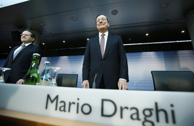 歐洲央行6日宣布維持基準(zhǔn)利率0.5%不變。歐洲央行行長德拉吉(右)在發(fā)布會上指出,歐洲央行已做好采取進(jìn)一步行動的準(zhǔn)備,并將密切關(guān)注歐元區(qū)的經(jīng)濟(jì)和金融發(fā)展。