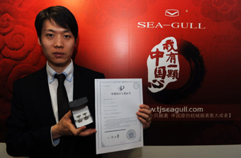 2011年3月31日,瑞士巴塞爾國際鐘表珠寶展知識產(chǎn)權(quán)委員會宣布,中國天津海鷗手表集團公司對一家瑞士企業(yè)的所謂侵權(quán)投訴提出反訴并勝訴。圖為海鷗手表集團公司副總經(jīng)理李贏展示該公司自主研發(fā)的陀飛輪不銹鋼袖扣飾品及其專利證書。資料照片 |