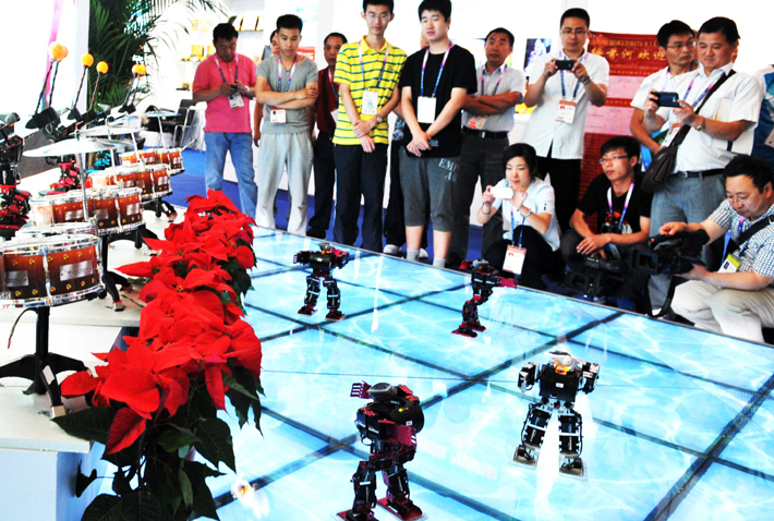 第24屆中國(guó)哈爾濱國(guó)際經(jīng)濟(jì)貿(mào)易洽談會(huì)的高新技術(shù)展區(qū),機(jī)器人舞蹈吸引了參會(huì)者的眼球。哈洽會(huì)是惟一被寫入中俄兩國(guó)元首會(huì)晤聯(lián)合公告的展會(huì)。記者王建威/攝 |