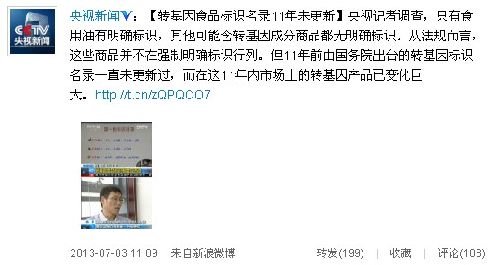央視記者調(diào)查,只有食用油有明確標(biāo)識(shí),其他可能含轉(zhuǎn)基因成分商品都無(wú)明確標(biāo)識(shí)。從法規(guī)而言,這些商品并不在強(qiáng)制明確標(biāo)識(shí)行列。但11年前由國(guó)務(wù)院出臺(tái)的轉(zhuǎn)基因標(biāo)識(shí)名錄一直未更新過(guò),而在這11年內(nèi)市場(chǎng)上的轉(zhuǎn)基因產(chǎn)品已變化巨大。
