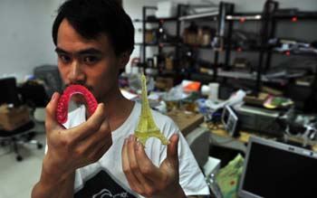 1987年出生的蔣程宇展示用3D打印機(jī)打印出來的模型和一付牙齒。蔣程宇說,他們研究設(shè)計(jì)的3D打印機(jī)精度更高、打印速度更快,今年年底將面世。記者