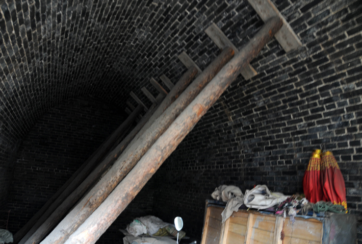 孝義市郝家寨村搬遷后的新房早已裂縫嚴(yán)重。圖為65歲的郝明林家,窯洞裂縫嚴(yán)重,且向下傾斜,為了防止窯洞坍塌,便用碗口粗的木樁子頂著。記者