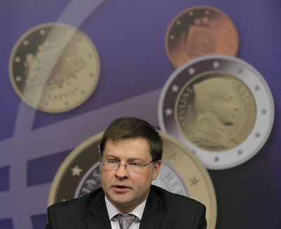 圖為拉脫維亞總理東布羅夫斯基斯當日在比利時首都布魯塞爾的歐盟總部出席加入歐元區(qū)的新聞發(fā)布會。