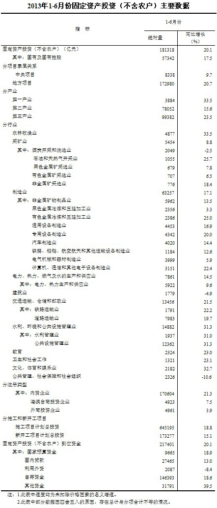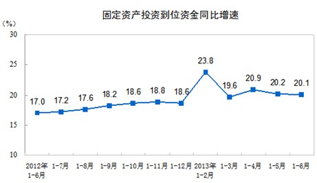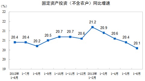 2013年1-6月份,全國固定資產(chǎn)投資(不含農(nóng)戶)181318億元,同比名義增長20.1%(扣除價(jià)格因素實(shí)際增長20.1%),增速比1-5月份回落0.3個(gè)百分點(diǎn)。從環(huán)比看,6月份固定資產(chǎn)投資(不含農(nóng)戶)增長1.51%。