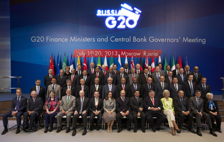 7月20日,出席二十國集團(tuán)財政部長和央行行長會議的代表在俄羅斯首都莫斯科馬涅什展覽中心會場內(nèi)合影。 當(dāng)日,二十國集團(tuán)財長和央行行長會議在莫斯科閉幕,會后發(fā)表的聯(lián)合公報敦促各國審慎調(diào)整貨幣政策,加強與其他國家的溝通與協(xié)調(diào)。