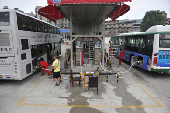 7月16日,公交車(chē)在加氣點(diǎn)內(nèi)加氣。 截至目前,貴陽(yáng)公交集團(tuán)公司已完成全部在用車(chē)的燃料清潔化工作,實(shí)現(xiàn)了“清潔公交”目標(biāo),使貴陽(yáng)成為全國(guó)在公共交通領(lǐng)域使用清潔燃料最多的城市。記者