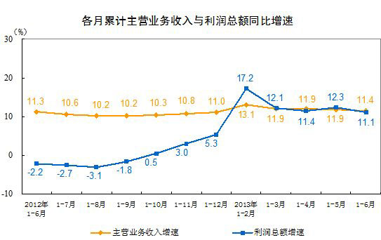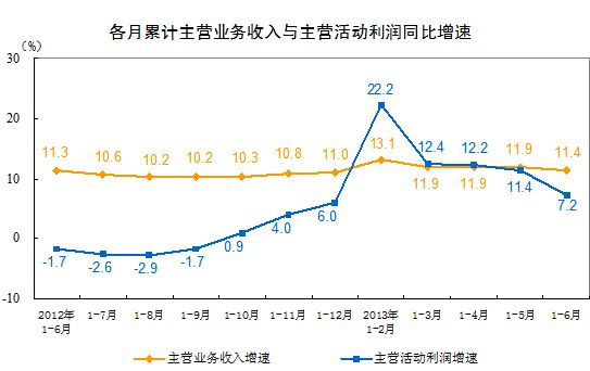 1-6月份,全國規(guī)模以上工業(yè)企業(yè)實現(xiàn)利潤總額25836.6億元,比去年同期增長11.1%,增速比1-5月份回落1.2個百分點,其中,主營活動利潤27891.8億元,比去年同期增長7.2%,增速比1-5月份回落4.2個百分點。