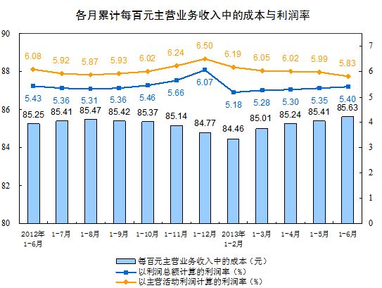 1-6月份,規(guī)模以上工業(yè)企業(yè)實現(xiàn)主營業(yè)務(wù)收入478365.4億元,比去年同期增長11.4%。每百元主營業(yè)務(wù)收入中的成本為85.63元,以利潤總額計算的利潤率為5.4%,以主營活動利潤計算的利潤率為5.83%。