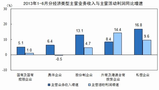 1-6月份,在規(guī)模以上工業(yè)企業(yè)中,國有及國有控股企業(yè)實現(xiàn)利潤總額7287.7億元,比去年同期增長4.8%,其中,主營活動利潤6426.7億元,比去年同期增長1%;集體企業(yè)實現(xiàn)利潤總額368億元,增長1.2%,其中,主營活動利潤433.4億元,下降0.5%;股份制企業(yè)實現(xiàn)利潤總額15091.2億元,增長9.1%,其中,主營活動利潤16526.2億元,增長4.7%;外商及港澳臺商投資企業(yè)實現(xiàn)利潤總額5983.9億元,增長14.8%,其中,主營活動利潤5964.8億元,增長14.4%;私營企業(yè)實現(xiàn)利潤總額7999.4億元,增長15.8%,其中,主營活動利潤10134.9億元,增長9.6%。