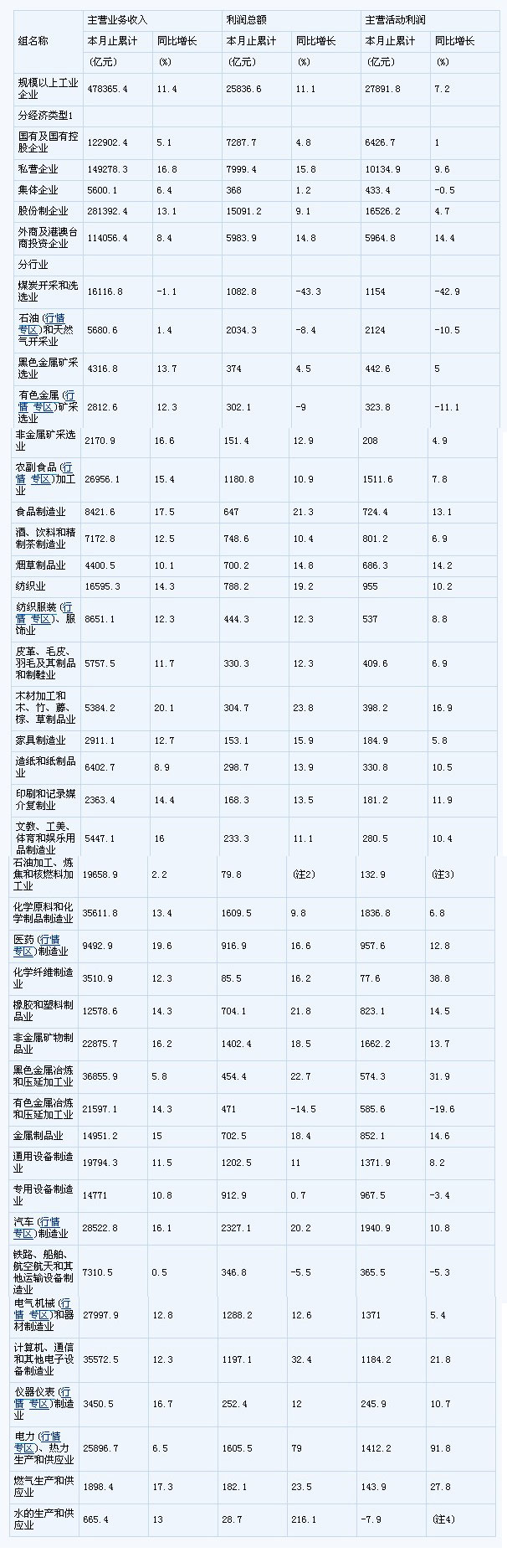 2、石油加工、煉焦和核燃料加工業(yè)去年同期利潤總額為-253.5億元。