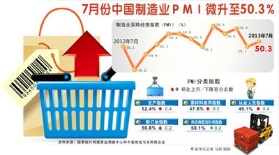 中國物流與采購聯(lián)合會、國家統(tǒng)計局服務業(yè)調(diào)查中心8月1日發(fā)布數(shù)據(jù)顯示,7月中國制造業(yè)采購經(jīng)理指數(shù)(PMI)為50.3%,比上月回升0.2個百分點。經(jīng)濟學家分析認為,PMI回升說明市場對經(jīng)濟趨穩(wěn)預期逐漸增加,大型國有企業(yè)開始受益于近期中國政府推出的一系列舉措。但考慮到其中從業(yè)人員指數(shù)已經(jīng)連續(xù)14個月位于臨界點以下,以及同日發(fā)布的匯豐中國制造業(yè)PMI連續(xù)第三個月放緩,當前穩(wěn)增長、保就業(yè)壓力仍然較大。
