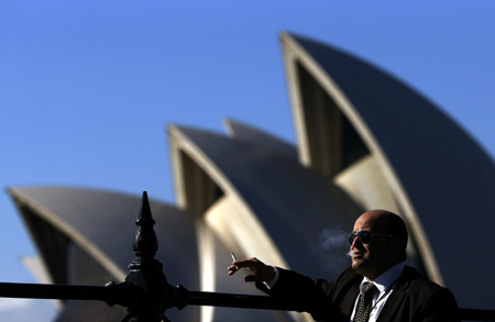 澳大利亞國庫部長克里斯·鮑恩與衛(wèi)生和醫(yī)學研究部長塔尼婭·普利伯塞克1日共同發(fā)表聲明,宣布澳大利亞將在未來4年內每年將煙草稅提高12.5%,用于治療與煙草相關的癌癥,并幫助聯(lián)邦政府重獲財政盈余。 圖為當日一名男子在澳大利亞悉尼歌劇院前抽煙。