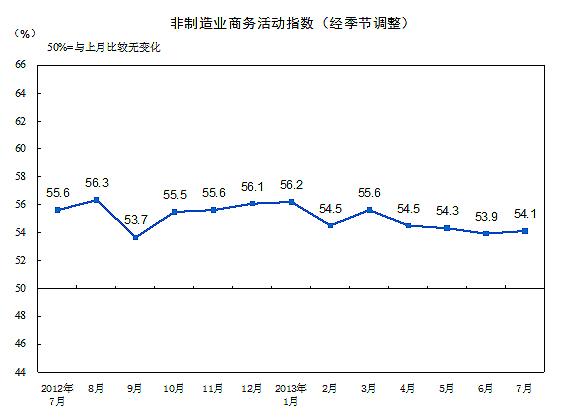 2013年7月,中國非制造業(yè)商務(wù)活動指數(shù)為54.1%,比上月小幅上升0.2個百分點。