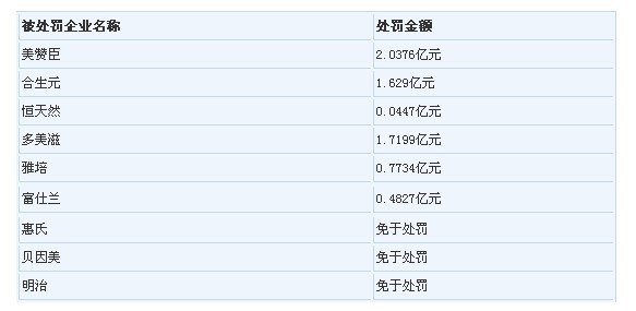 國(guó)家發(fā)展和改革委員會(huì)7日宣布,合生元等6家乳粉生產(chǎn)企業(yè)因違反《反壟斷法》限制競(jìng)爭(zhēng)行為共被罰約6.7億元,成為我國(guó)反壟斷史上開出的最大罰單。3家企業(yè)因配合執(zhí)法機(jī)關(guān)調(diào)查并積極整改被免除處罰。